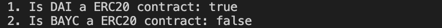 console.log(`2. Is BAYC a ERC20 contract: ${isBaycERC20}`)